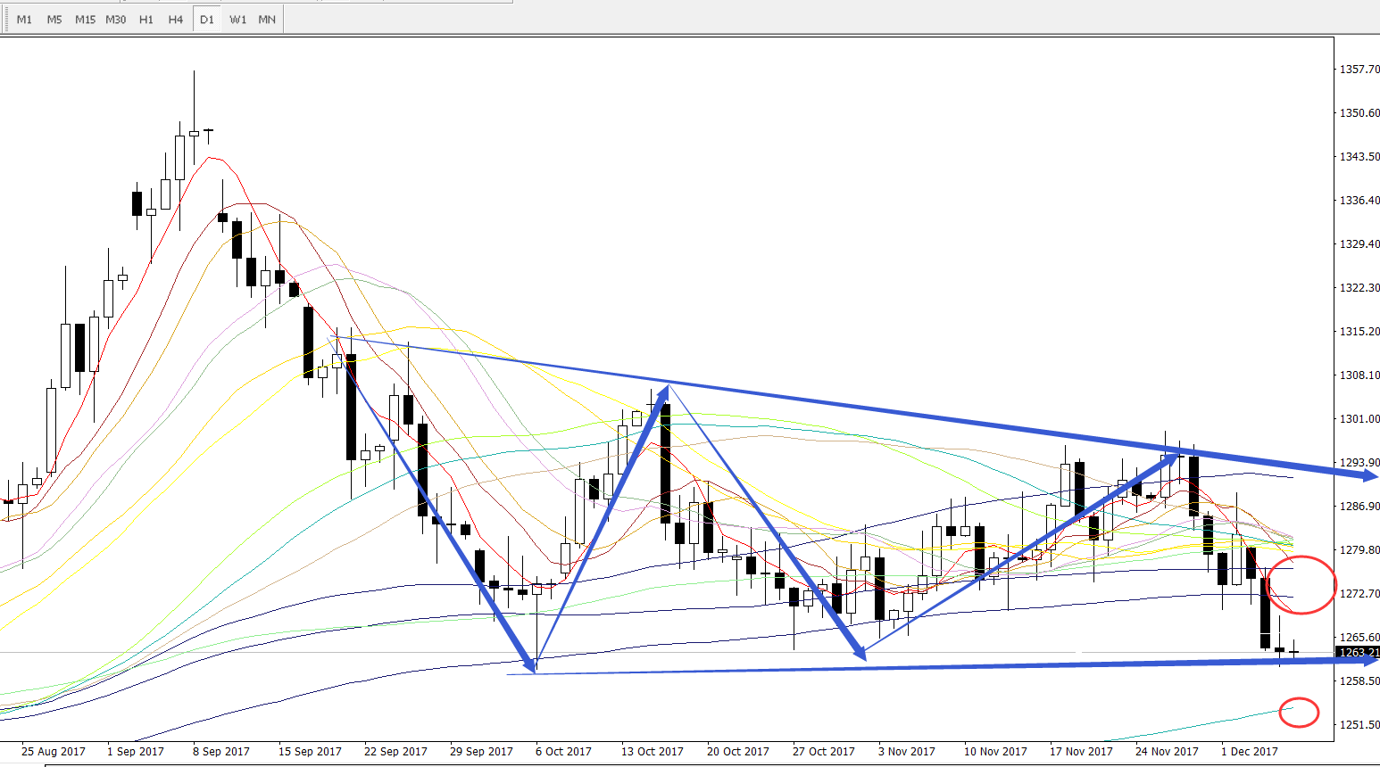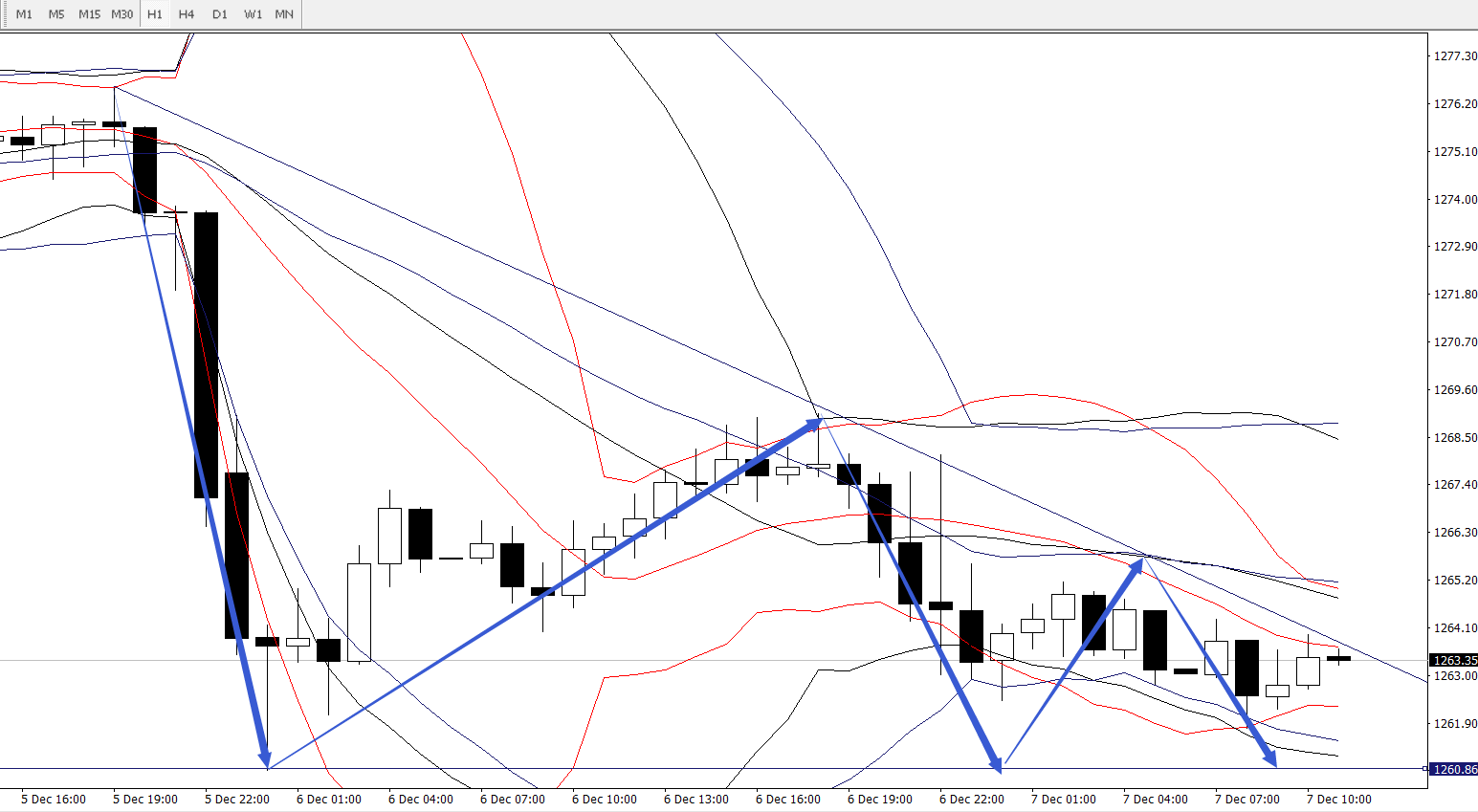 从1小时图来看,目前价格仍旧运行于三角整理的结构当中,短线上要重点关注三角整理结构的一个破位情况,若能有效下破整理结构的下轨1260一线,下方空间不排除会有进一步打开的可能。考虑到非农越来越近,建议破位后不要继续盲目激进的追空,短空建议等待相对高位再去进场,轻仓操作,快进快出。