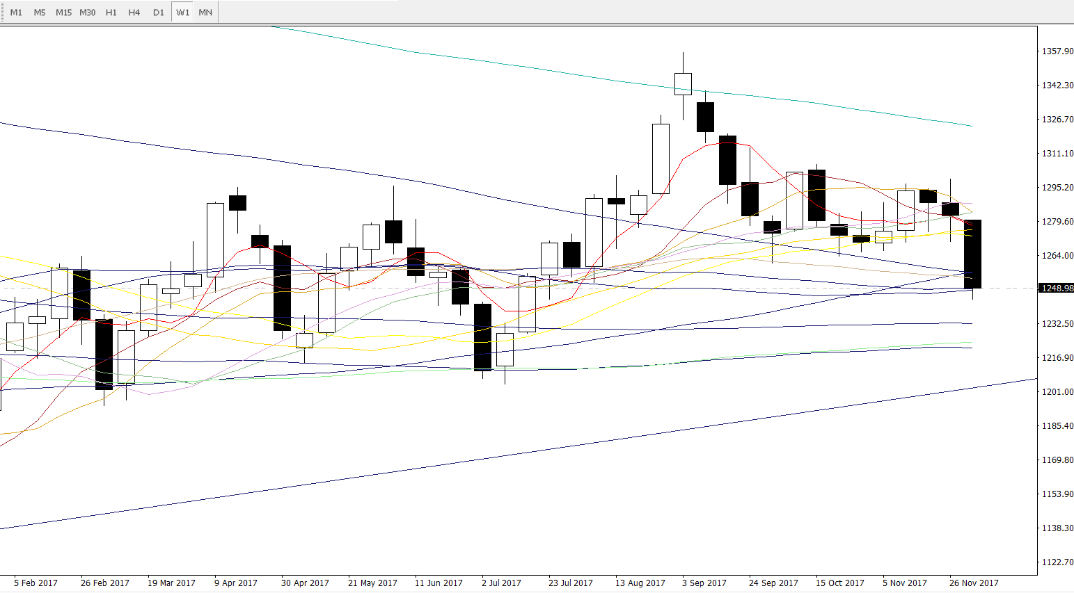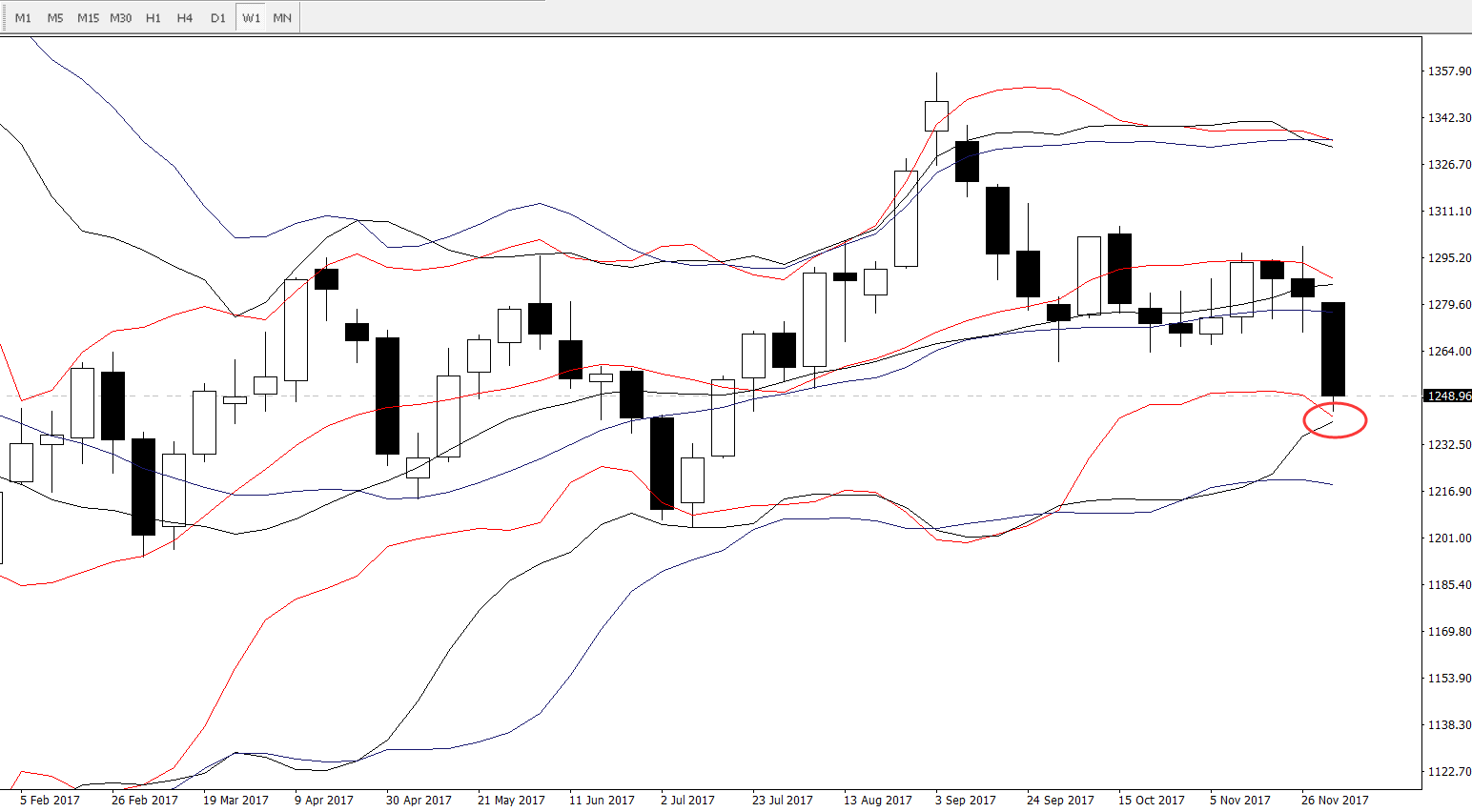 周线级别布林轨,如图,目前价格有效受撑于周期分别为14、21布林轨的下轨交叉点1241美元上方,技术上行情若能回落到1241附近可尝试短线多单的布局。