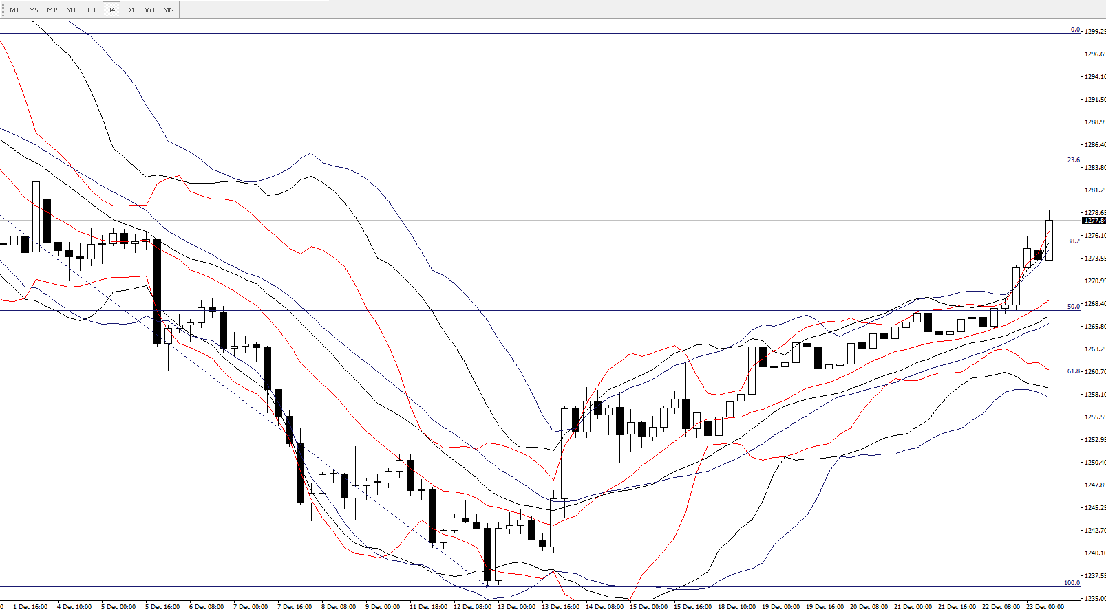 从4小时图来看,目前价格短线上已经上穿斐波纳0.382一线,日内短线价格料将运行于斐波纳0.5一线的支撑与上方0.236一线的压力区间内,即1268-1284区间。而1268一线刚好靠近周期分别为14、21、26布林轨的中轨。所以激进者可选择于1268-1284区间轻仓进行高抛低吸,稳健者可等待价格成功回落至1268附近再选择低多进场。