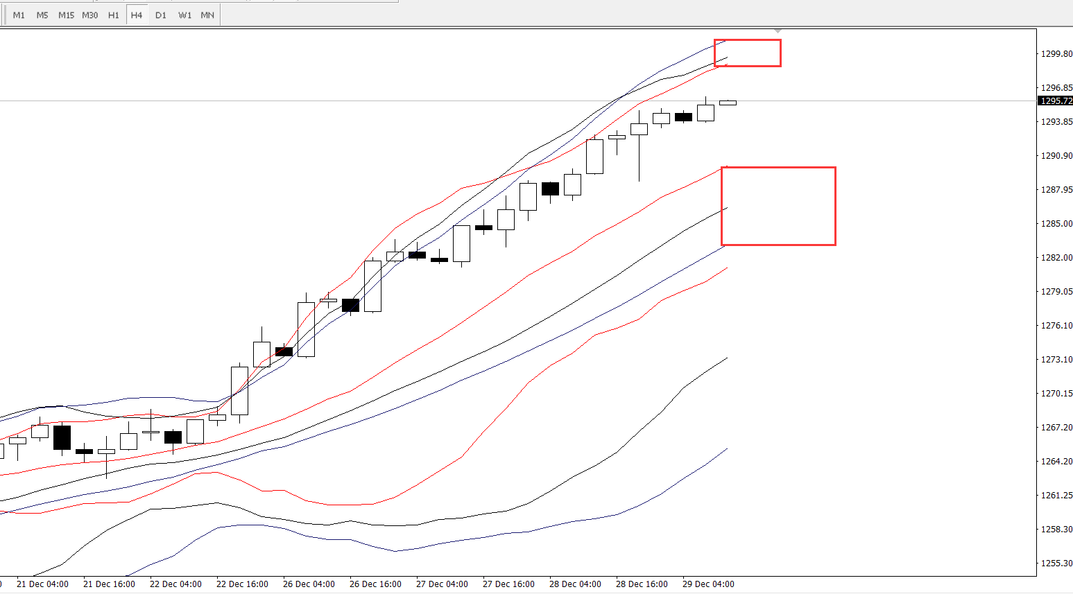 小时图,目前短线价格上多头上涨攻势有所放缓,且周期分别为14,21,26布林轨有同时开始走横的迹象,当前要重点关注上方周期分别为21,26布林轨上轨的交叉点1296.5一线,短线上该位置若能守住,那么在欧盘时段不排除先走出一波短线回调的行情走势。若多头继续保持强劲且快速上破1296.5一线,那么上方则要重点关注1300整数关口。