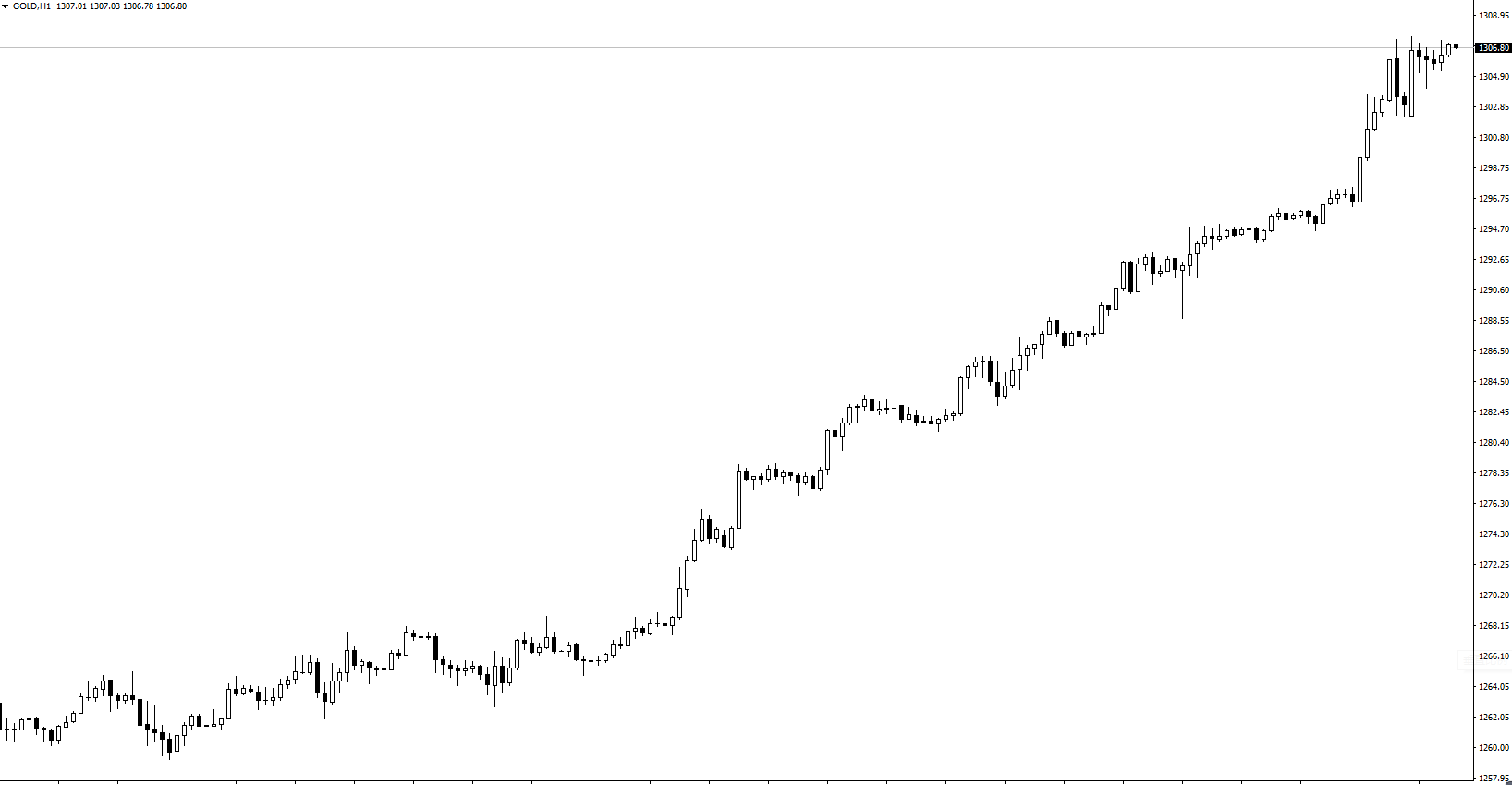 【黄金小时图】上图是黄金小时周期走势图。从图中可以看到,目前黄金处于单边大多头趋势之中,期间几乎没有任何的回调,走势尤其强势。上周五,黄金继续保持强势上行,一举突破1297一线压力位置,来到1307美元附近,显示多头上涨的决心。此时,很明显的是,黄金大多头走势无疑,那么思路上看多做多跟进多,任何的高位可能就是后续的低位,因为价格只会越来越高。