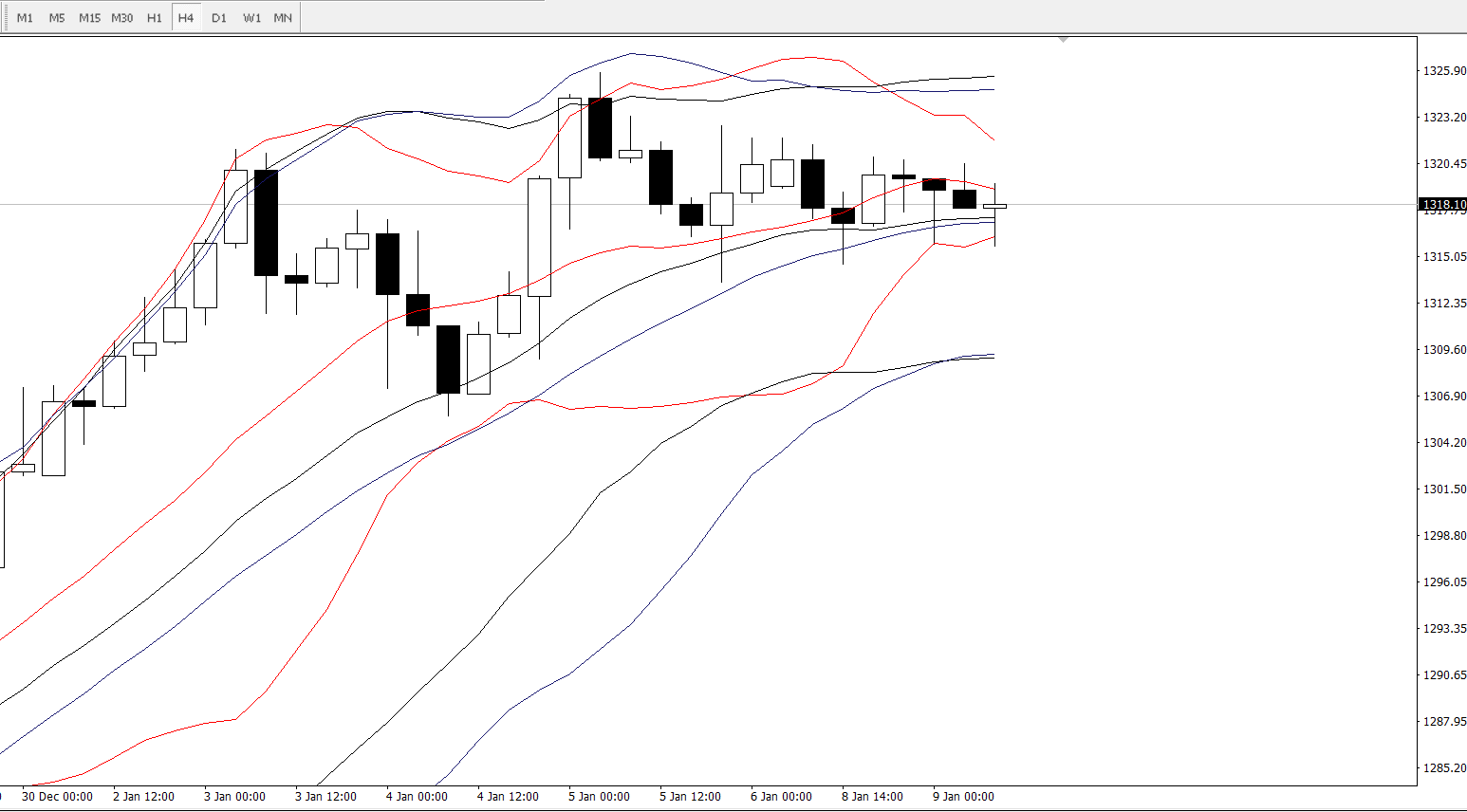 4小时图,目前周期14的布林轨已经明显收口,而周期21、26布林轨走横,且上下轨价格非常接近,上方压力统一指向1325.5一线,该位置也是短线上前期的一个高点,下方支撑统一指向1309一线。日内黄金短线上料将于1309-1325.5区间运行。