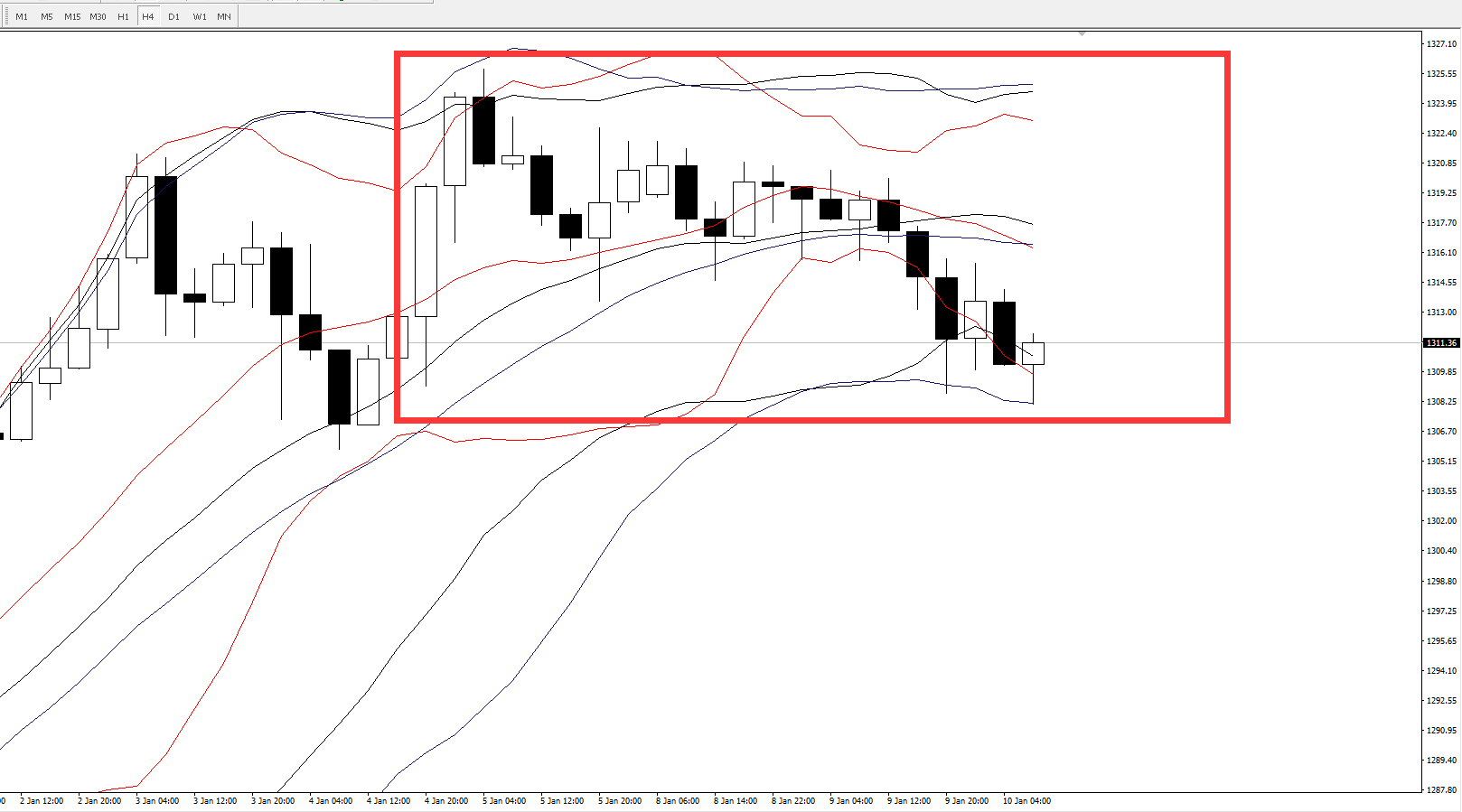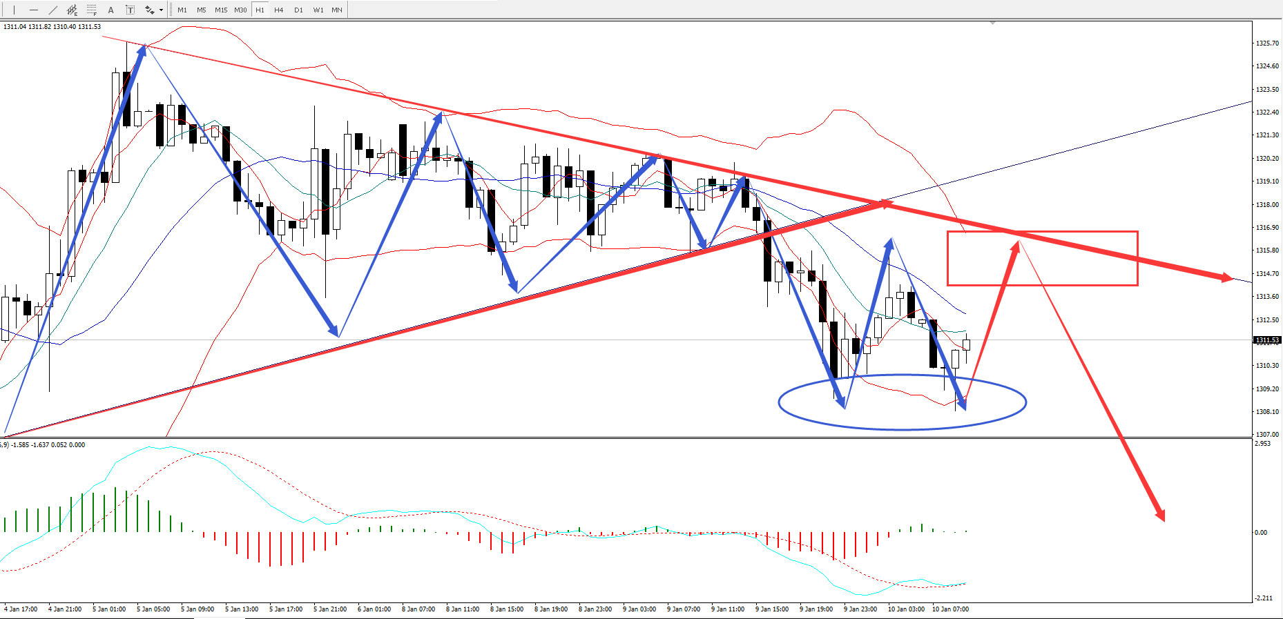 4小时图,目前周期14的布林轨已经开口向下且价格最低打到1308一线,而周期21、26布林轨整体上仍属于走横的一个状态,目前短线上于下轨区间1308-1311一带的支撑较强,需要重点留意。行情日内若出现快速反弹,上方要留意各周期布林轨中轨位置区间1316-1318的压制情况。