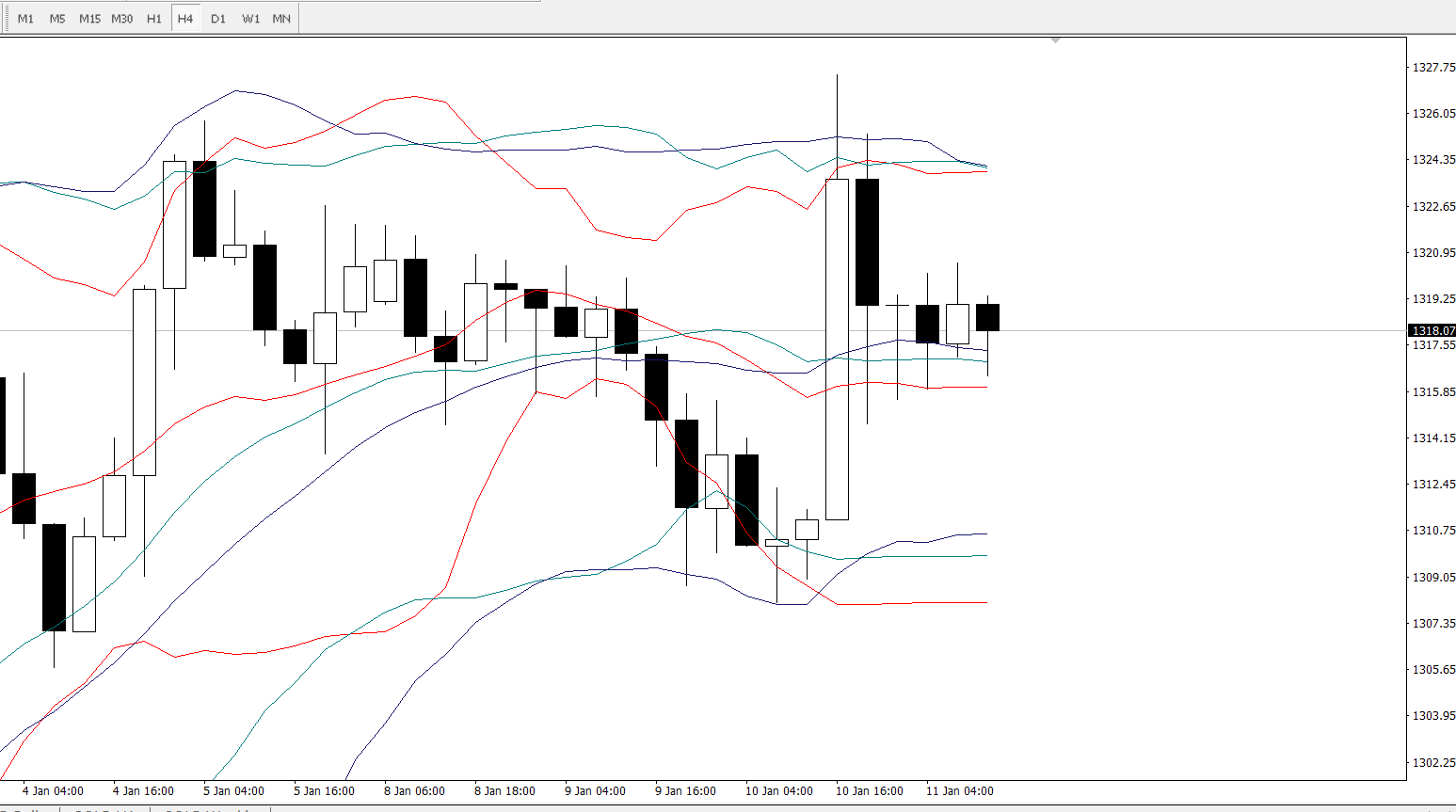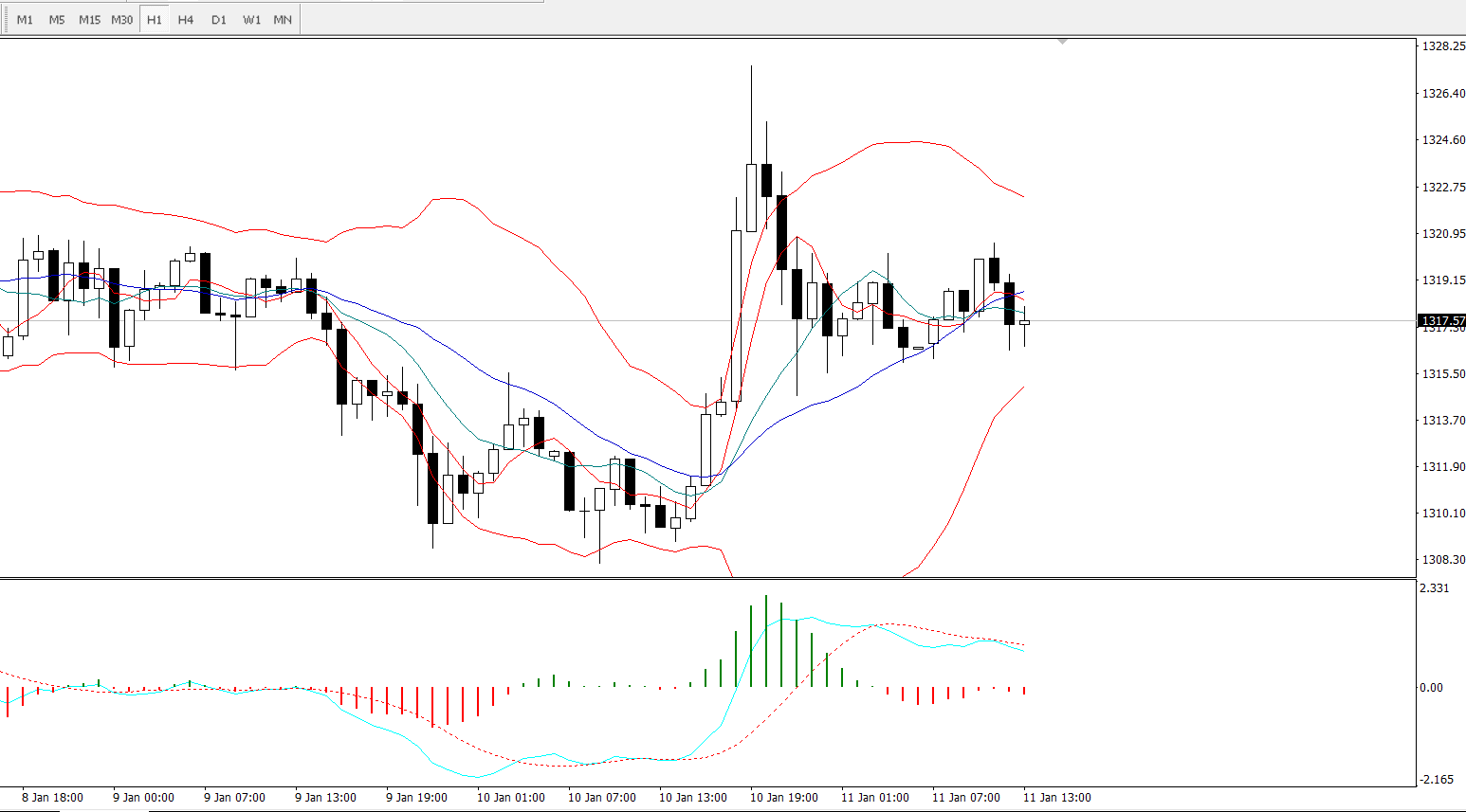 4小时图,目前周期14、21、26布林轨整体上同时处于走横的一个状态,短线上要重点关注中轨区间1316-1318一带的支撑情况,若下破,下看下轨区间1308-1310。上方要关注各上轨的交叉点1324一线的压制情况。