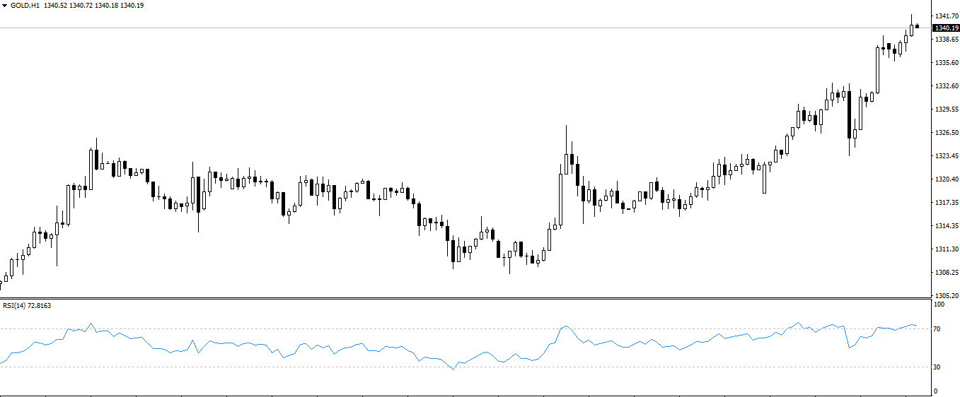 [黄金小时图]回顾上周五行情,黄金再次单边大涨,从1323美元附近上涨至最高1339美元位置,日内涨幅高达16美元,走势较为强势,那么趋势上依旧保持多头不变。而上图是黄金小时周期走势图,可以看到,经过前一波的上行之后,RSI指标上已经运行到了超买区,并且指标在高位也出现了滞胀;结合金价周五的大幅拉升来看,关注接下来短期黄金是否会出现技术性调整行情,那么操作上亦谨防追多。今日重点关注上方1345-1347附近的缺口压力,若后续不能突破上去,那么接下来走调整的概率较大。