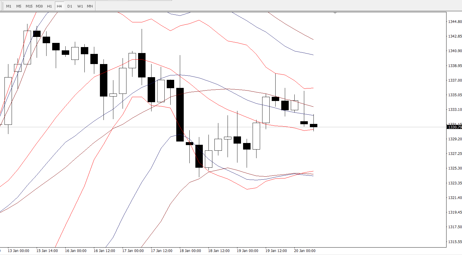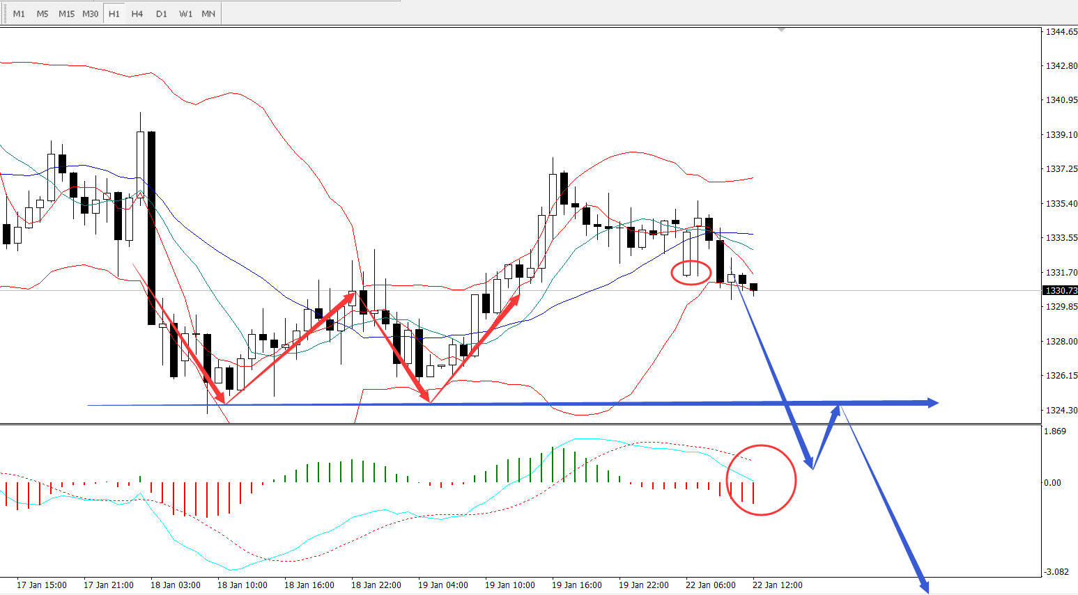 4小时图,目前短线上价格受撑于周期14的布林轨中轨,该支撑若被打破,价格短线上或将快速下行至下方周期14、21、26布林轨的下轨位置1324.5一线。而上方要重点关注的是周期14的布林轨上轨的压力情况,前面几根4小时线都是受其有效压制,且都是影线的高点触及后就出现回落,特别是上一根4小时线出现了较长的上影线,所以当前的4小时图短线上整体也是偏空的一个状态。