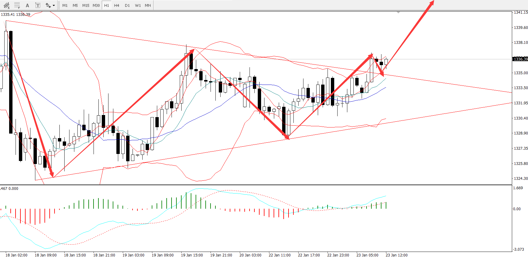 4小时图,目前短线上需要留意的是周期14、21、26布林轨在同时收口,且当前价格短线上受压于周期14、21、26布林轨的上轨区间1336.5-1338.5,该区间若能上破,那价格短线上或将快速上行至1340上方,所以需要重点关注。目前周期14、21、26布林轨的中轨区间1331.5-1333.5,稳健者可于该区间尝试低多短线布局。