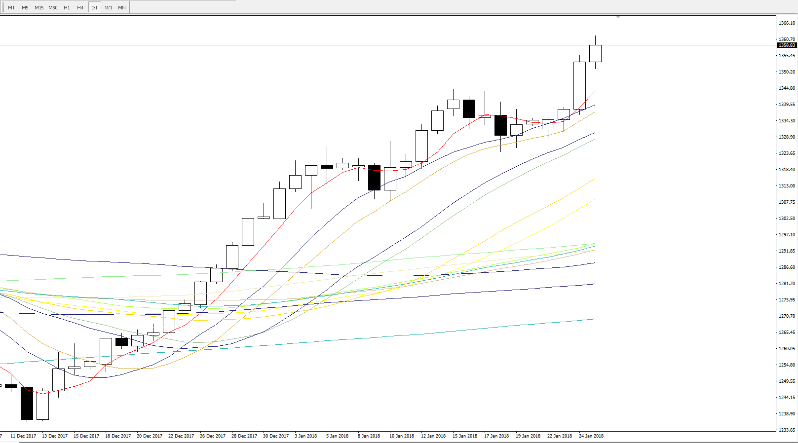 日线图,目前从K线上来看,昨日的日线已经是成功破坏了前面的小顶,且当前实体部分已完全收于上周高点1344上方,今日1344这一线位置刚好是5日均线的支撑位,短线上若出现技术性回调,1344这一线的支撑需重点留意。