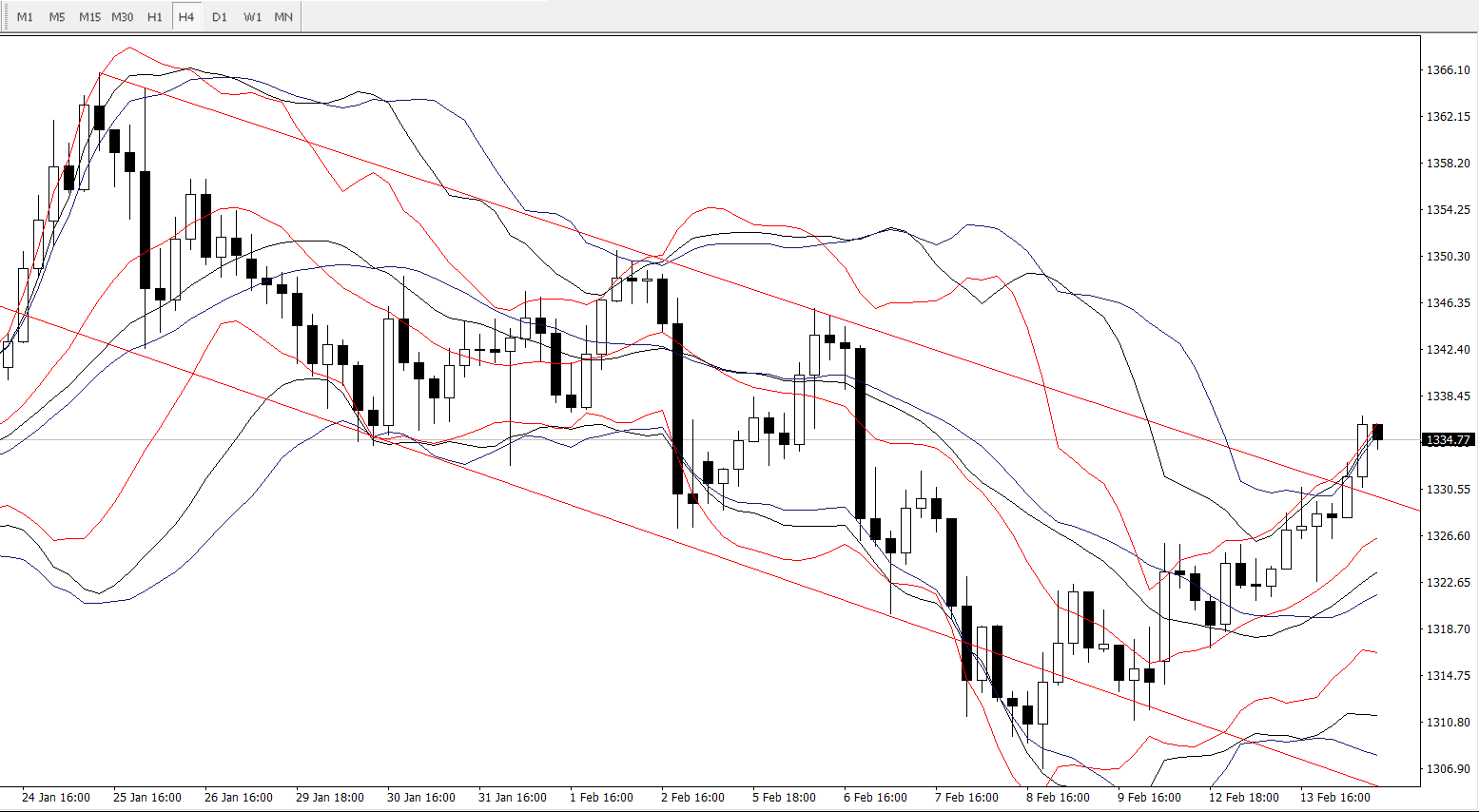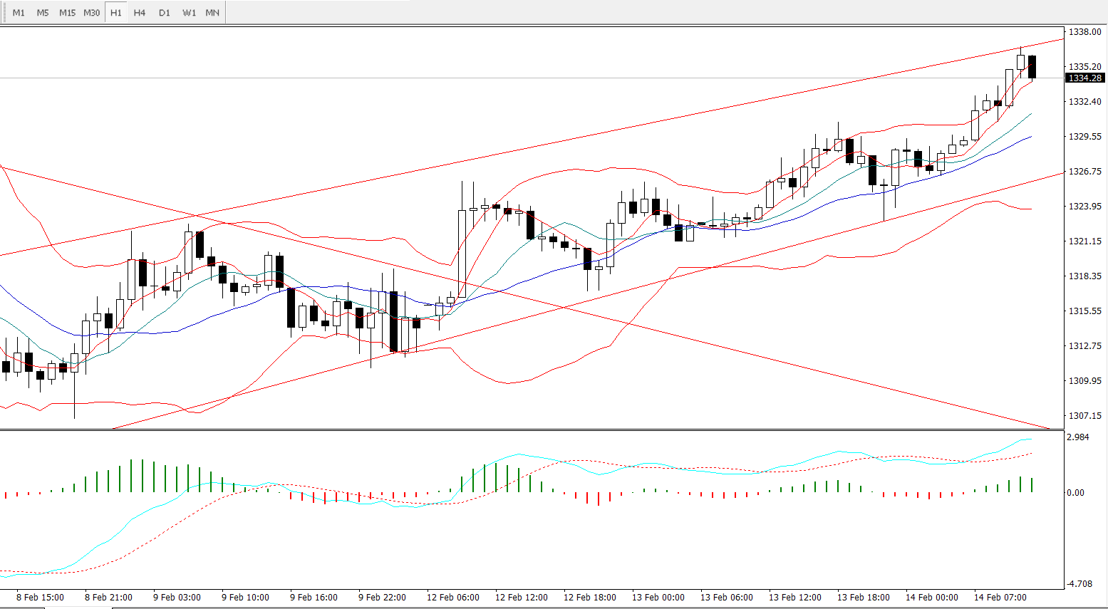 4小时图,短线上4小时线实体部分已经成功站稳于下行通道的上方,且沿着周期分别为14、21、26布林轨的上轨持续发力向上,当前要重点留意的是各周期布林轨中轨区间1322-1326的支撑情况,日内短线稳健者可等待价格回落该区间后再去进行短线多单的介入会较为稳妥。激进者可考虑价格回踩4小时下行通道上轨1330附近去进行短线多单的博奕,激进的单子建议轻仓,控制好风险。