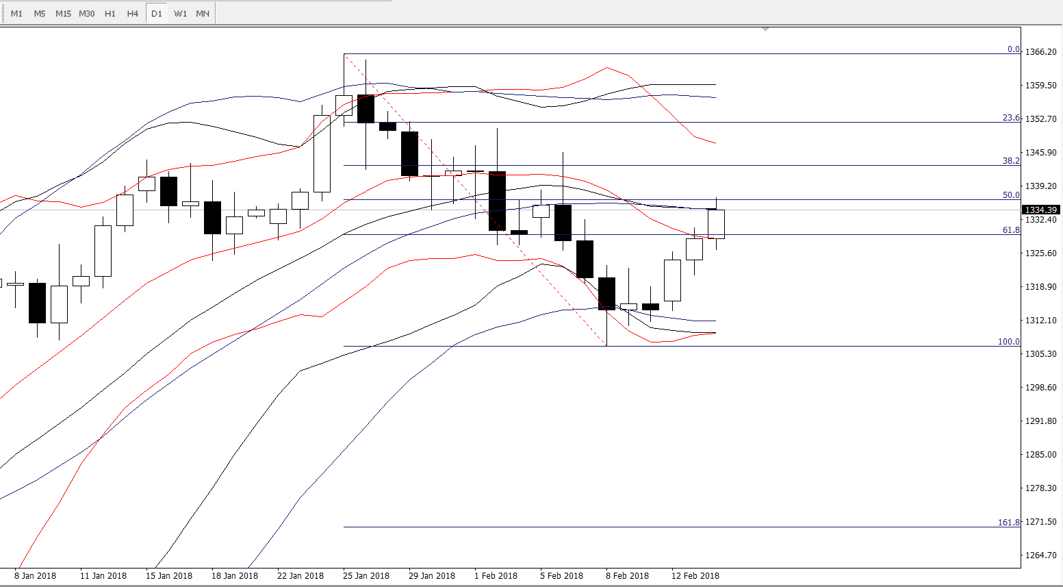 日线图,目前短线上价格已经于亚盘成功触及斐波纳50%的反弹位置,日线级别的布林轨我们要重点留意周期分别为21与26的布林轨中轨的交叉点1335这一线的压力情况,若日线实体部分能成功收于1335下方,那么短线上黄金多头的动能在没有其它基本面的影响下或将有所衰减。上方日内要重点留意1343的压力位,该位置是斐波纳38.2%的反弹位置。