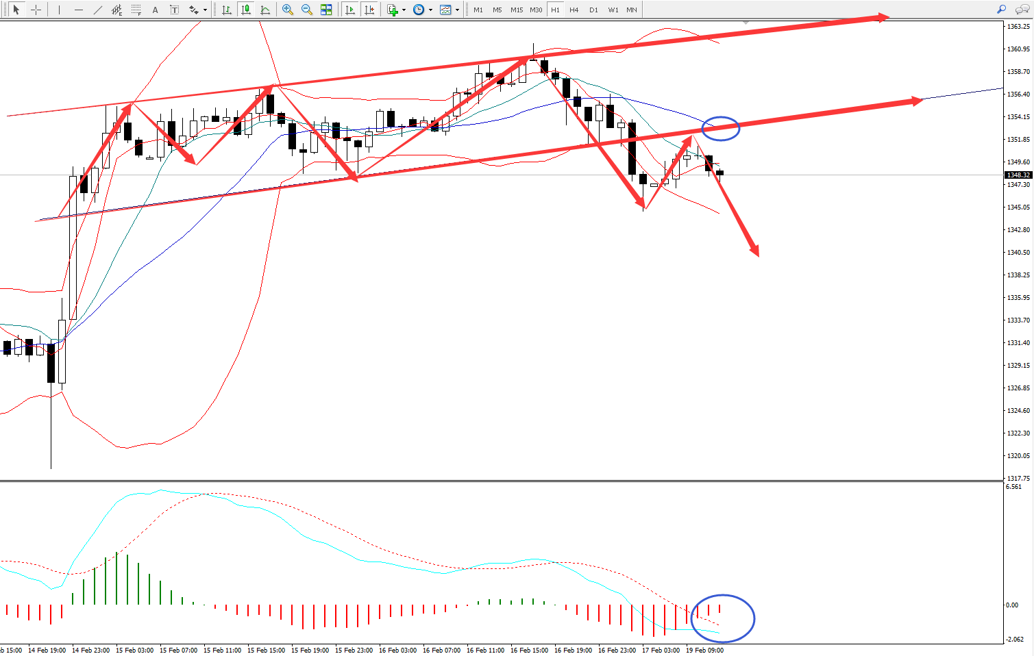 从1小时图来看,目前短线上价格已经成功走出小级别的上行通道,且于早间亚盘反弹后仍受压于该上行通道的下方,当前布林轨开口向下,短线价格持稳于布林轨中轨下方,短线均线系统出现死叉呈现明显的空头信号,MACD的快慢线与柱体处于零轴下方,短线上整体偏空,所以建议稳健者欧盘时段短线以高空为主,等待1351-1353附近进场,目标下看1345-1343。空单止损不宜过大,建议3美金左右或是明确顶部的上方。短线上1353的压力是比较重要的,该位置是下行通道下轨压力位与布林轨中轨的交叉点。若欧盘前已经提前走出一波回落行情,在节奏已发生变化的情况下,空单则要谨慎进场或考虑不进场。