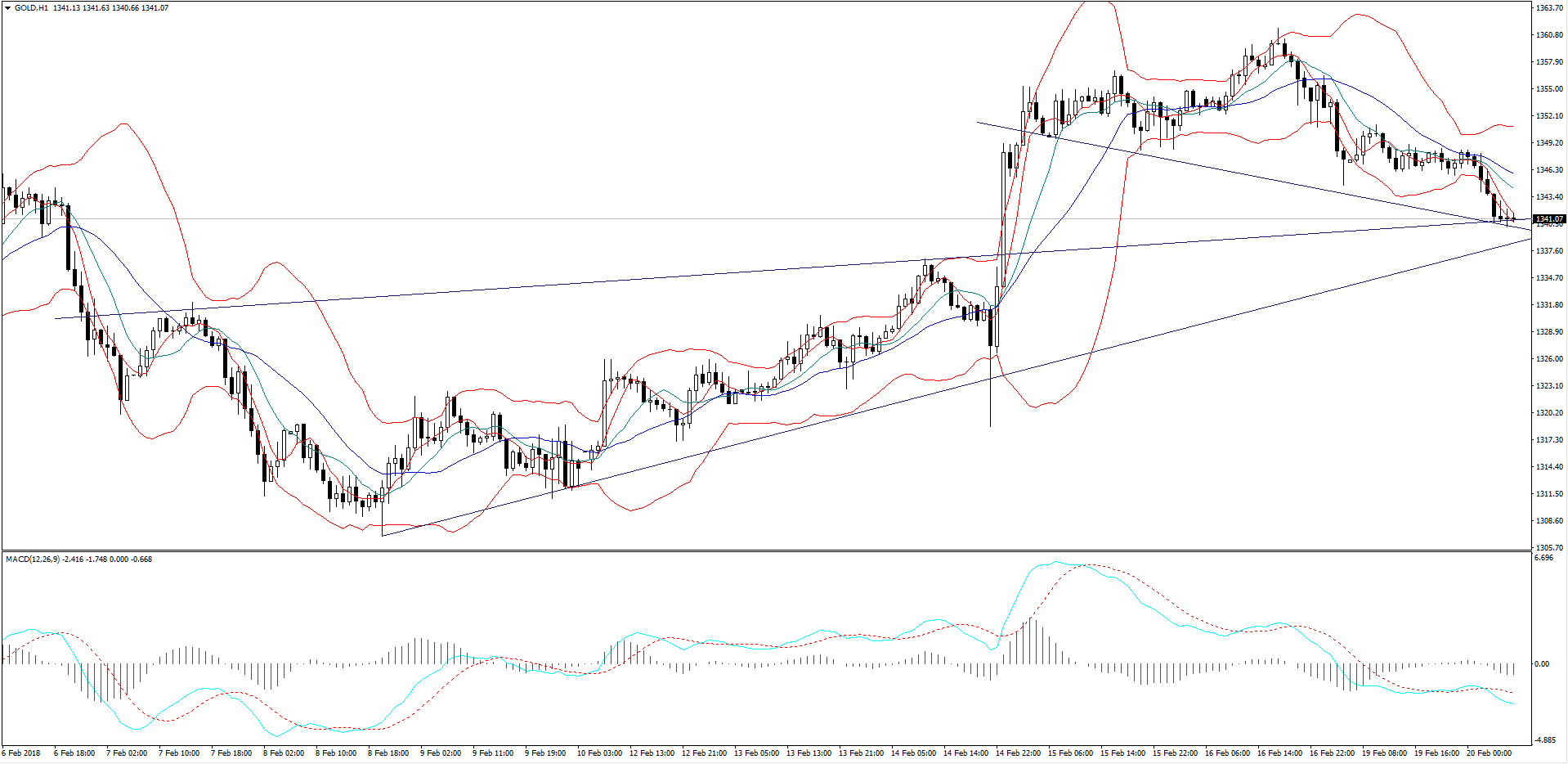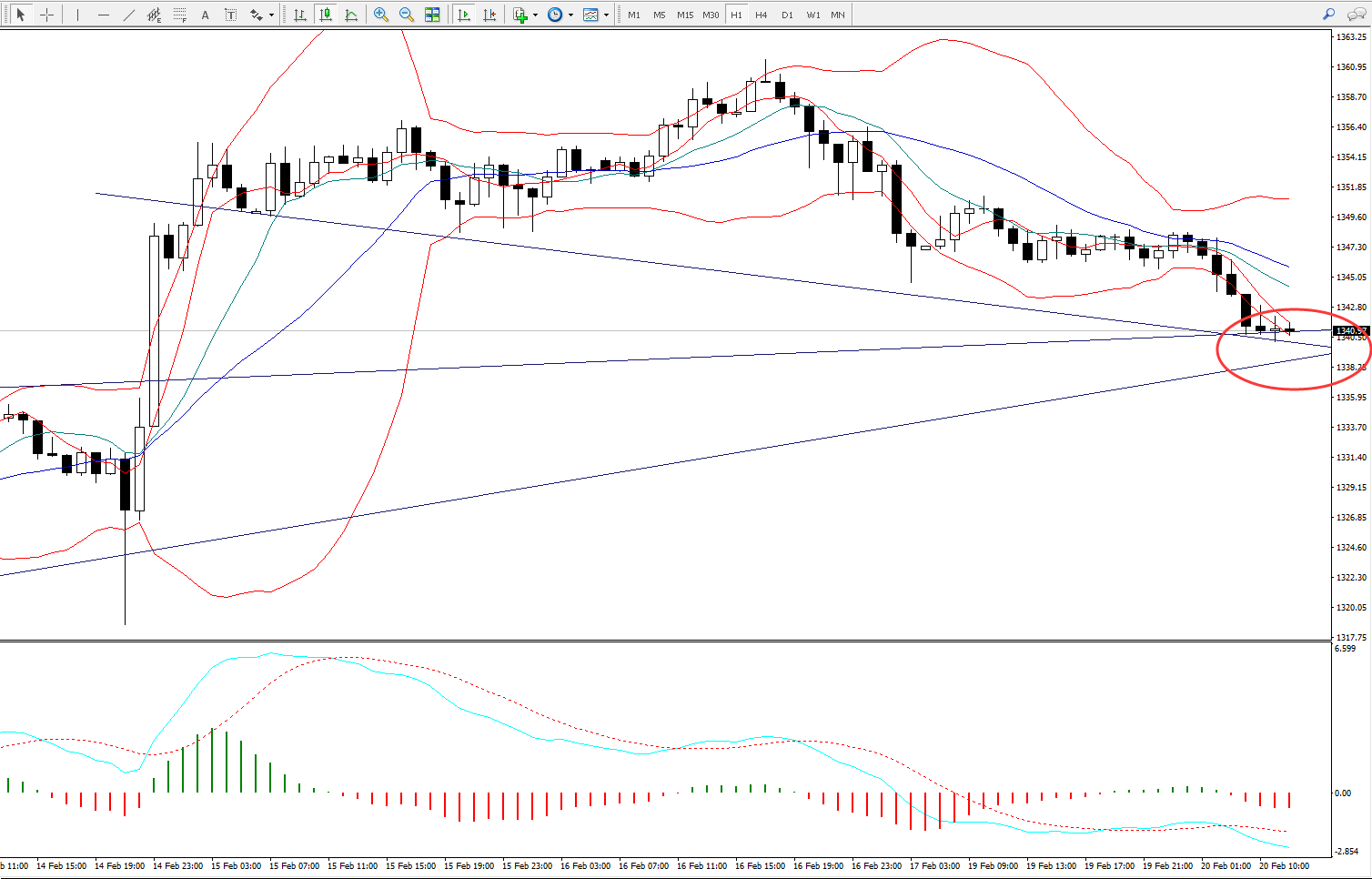 从1小时图来看,目前短线上价格已经重新回踩前面较大级别的楔形整理结构的支撑区间1338-1341,当前布林轨仍旧开口向下,短线价格受撑于布林轨下轨。短线均线系统出现低位二次死叉,空头信号有减弱迹象,MACD的快慢线与柱体均重新靠近零轴,短线上又到了多空争夺的关键区域,所以稳健者建议欧盘时段观望为主,等待空头再下打一波或出现明确企稳迹象后再考虑逢低布局多单,短线目标先看1350附近,波段单可分批减仓后博后市行情上破上周高点1361.5。
