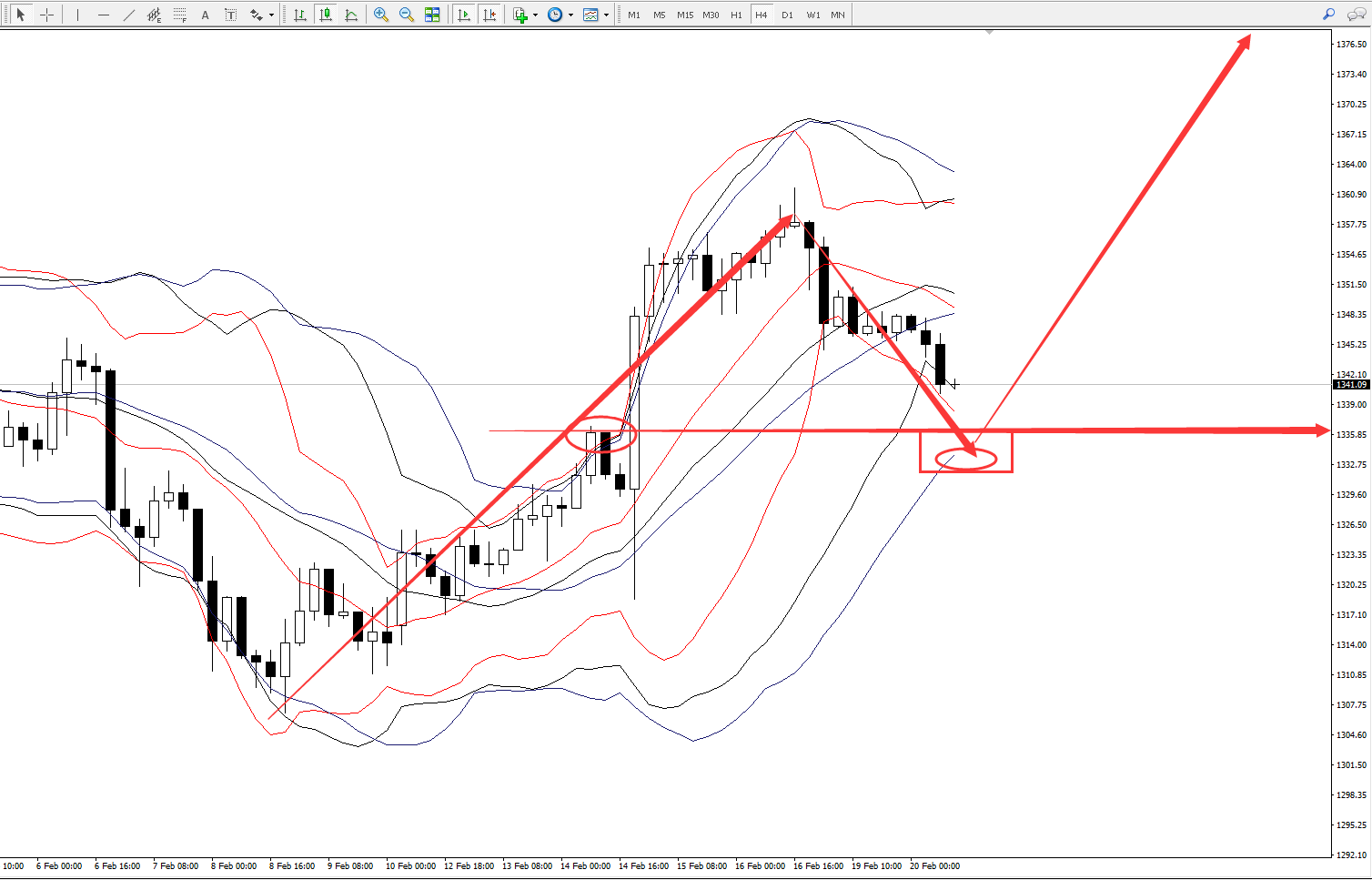 4小时图,短线上当前要重点关注下方1333-1336区间的支撑情况。1336是前期4小时K线形态的一个小顶的支撑,1333是周期26布林轨下轨的重要支撑。所以稳健者日内短线上可考虑于1333-1336附近轻仓做多,止损1330下方,目标上看1345-1350-待定。1350一带是各周期布林轨的中轨压力位,短线多单建议于该位置适当减仓,保护盈利。