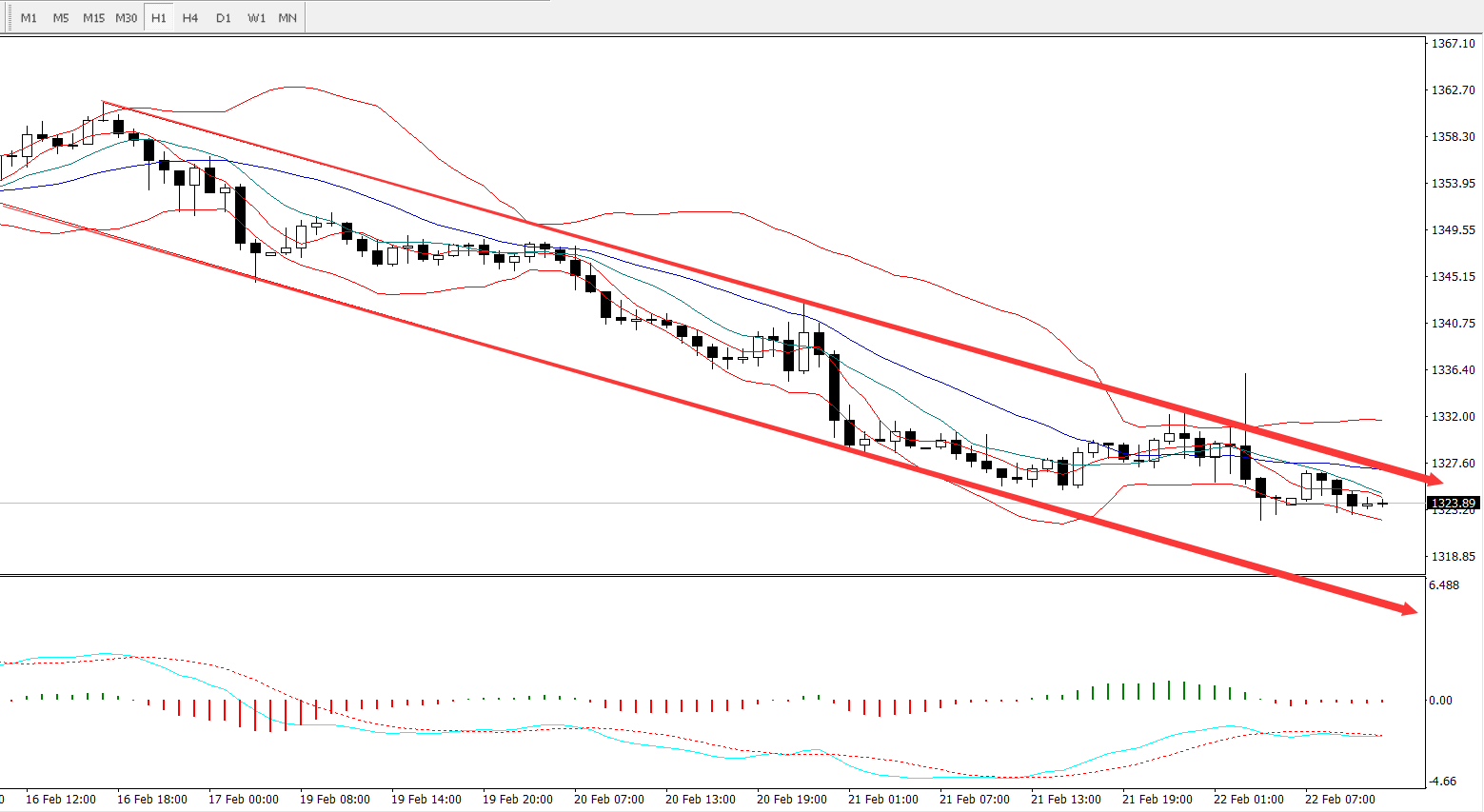 从1小时图来看,目前短线上价格仍运行于小级别下行通道当中,当前价格再次靠近上轨压力位附近,当前布林轨有逐步走横迹象,短线价格受撑于布林轨下轨。短线均线系统要留意是否能形成底部金叉,MACD的快慢线与柱体重新靠近零轴,短线上美盘前整体上或偏震荡,所以稳健者建议观望或等待价格再次下打到下行通道支撑位1315附近再尝试低多或等其上破后走出该下行通道再去介入多单的操作,激进者可尝试于下行通道上轨压力位1327附近进行轻仓短空操作,止损放通道上方或1330上方即可。