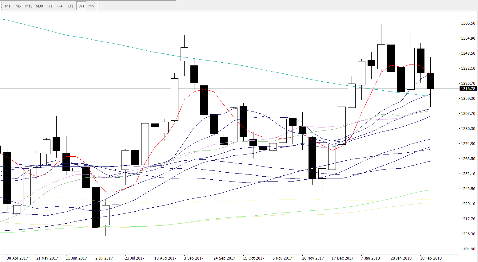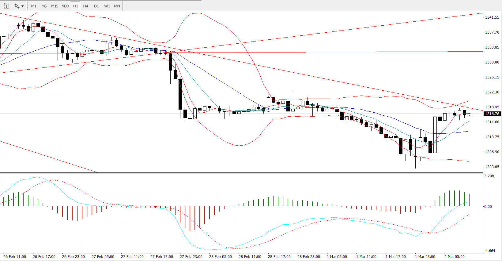 均线系统上,日线级别要重点关注10日均线与60日均线叉点1325的压力,短线上同时还要关注5日均线与66日均线叉点1319的压力,下方要重点关注100日均线1304的支撑,而周线级别要重点关注5周均线与10周均线的交叉点1328一线的重要压力,下方则要重点关注13周与300周的叉点1311的支撑。
