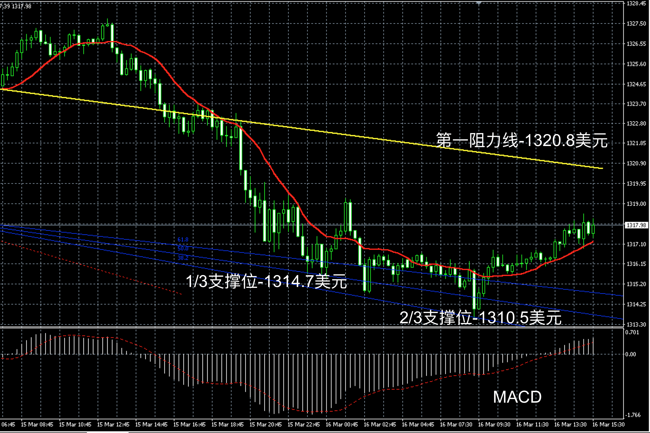 黄金阴阳烛录得小幅反弹后收短,末端处于红色日均线中位,短线MACD显示呈中性,黄金价格晚上或在1318美元附近徘徊,高低多空扩大信号可分别参考1320.7和1316美元附近,短线若有突破可顺势看涨看跌2-3美元左右。