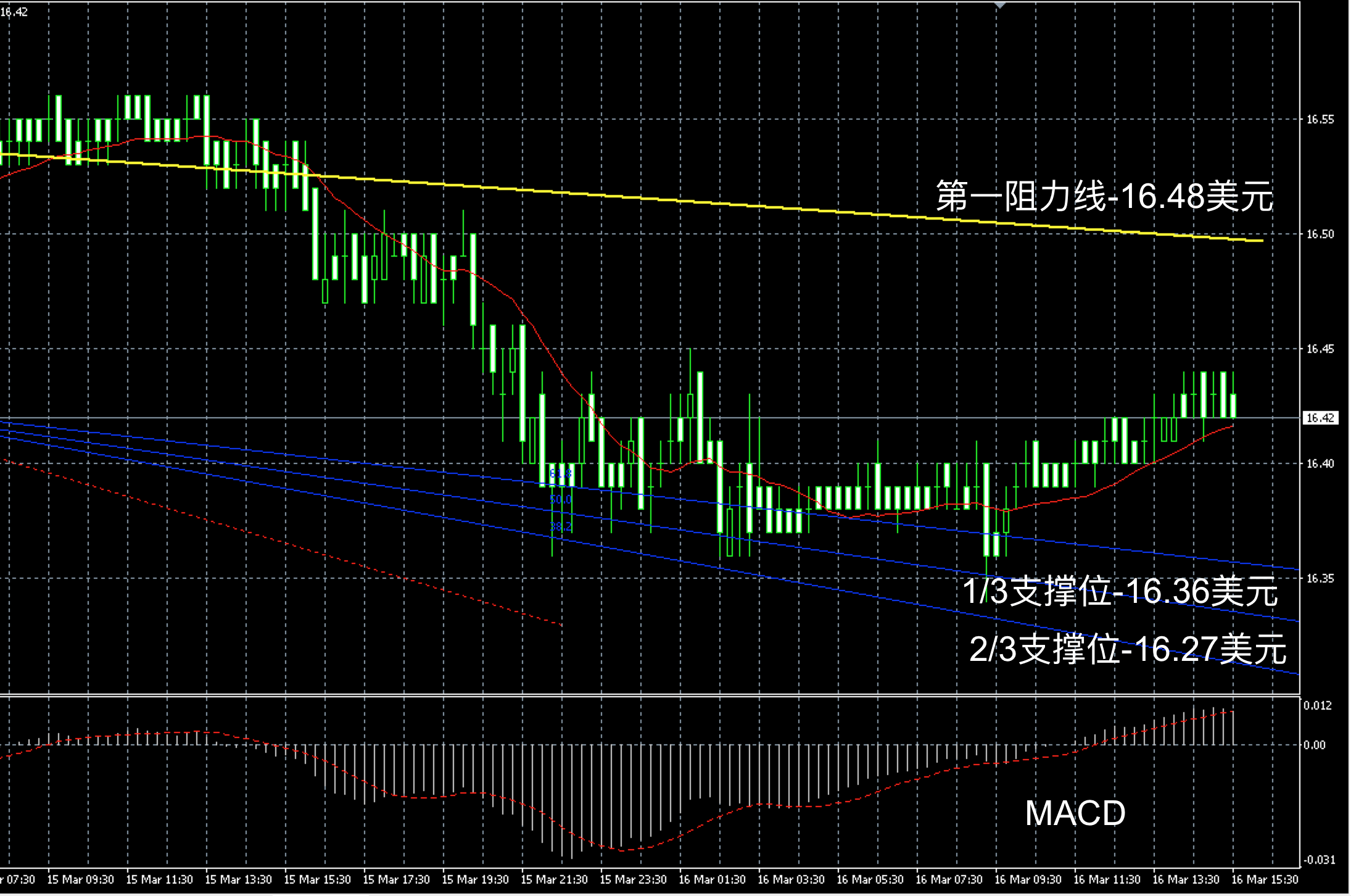 白银阴阳烛录得回落后收平,末端处于红色日均线中位,短线MACD显示呈中性,白银价格晚上或在16.4美元附近徘徊,高低多空扩大信号可分别参考16.48和16.36美元附近。