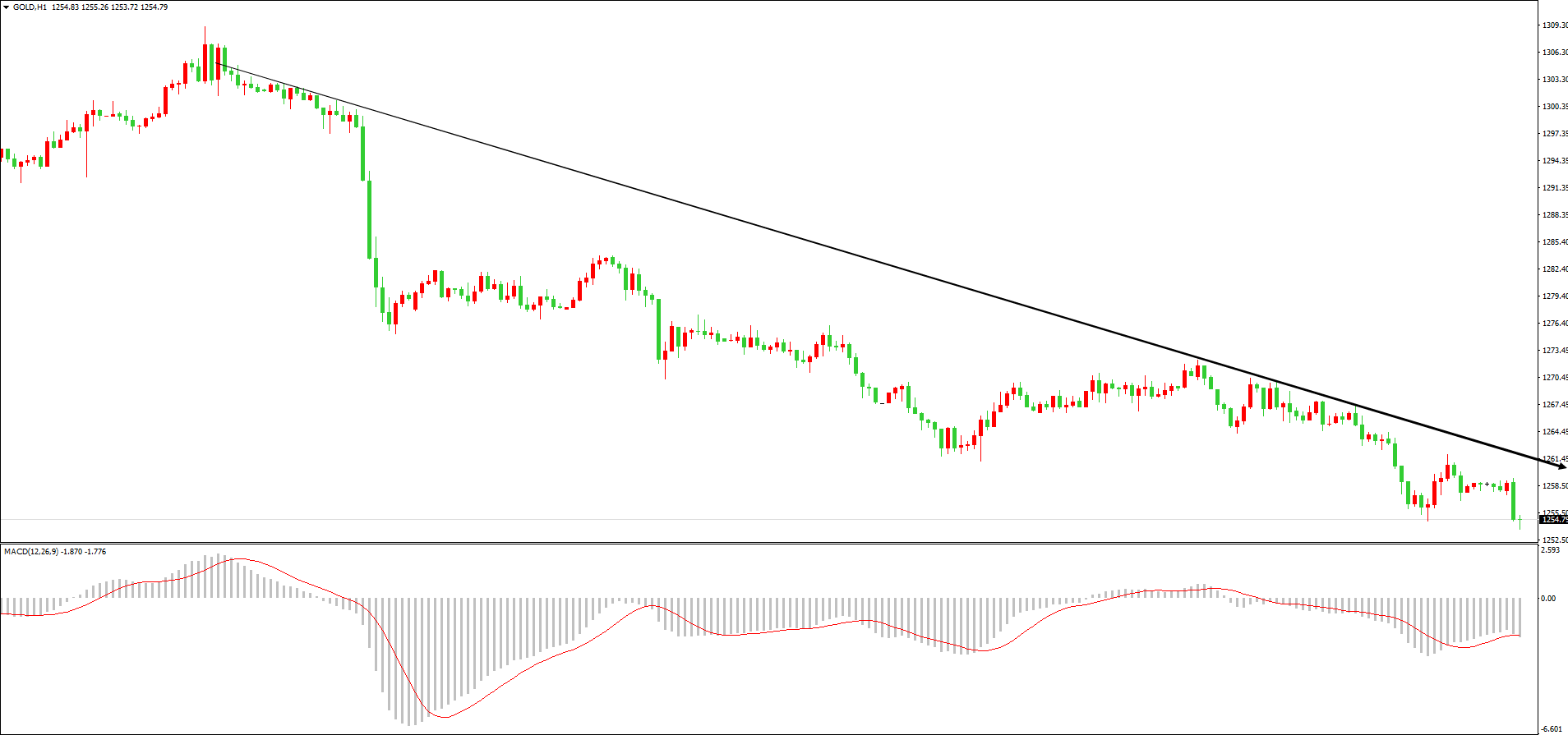 昨日受制于美元指数的上涨压力,黄金再受打压下行,直接跌破1260前期低点位置,最低运行至1254美元一线位置,日内上演大空走势。上图是黄金1小时级别走势图。目前趋势上依旧维持空头趋势不变,在前期亦一直强调趋势空头;而短期走势上暂无明显企稳或转折迹象,那么思路上依旧维持看空为主。此时,经过下行黄金短线级别即将接近1250整数关口为主,若后续运行至该支撑位,需关注短线的反弹或修复走势;而日内在没有达到1250美元前,依旧可逢高做空。
