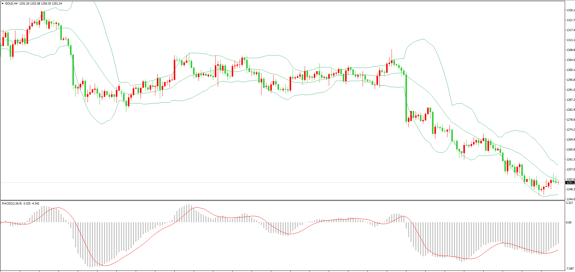 上图是黄金1小时周期走势图。可以看出,黄金经过上周五的短线反弹,价格已经触及上方1255一线重要阻力,测试无法有效突破上去,再次进入回落走势,此时处于1245低点至1255高点阻力之间运行;而趋势上黄金维持明显空头走势不变。小时图中,黄金价格此时已经被BOLL线中轨压制,无法突破,且布林线通道开始走平,有继续向下的迹象,故日内操作上建议做空为主。