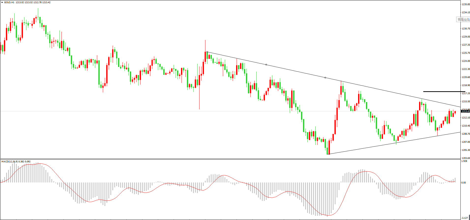 上图是1小时周期走势图。目前黄金依旧处于收敛三角形之中运行,技术上并没有形成破位,短线走势较为震荡反复,方向性并不强,那么操作建议高抛低吸短线为主。而此时黄金形态上接近向上迹象,但在1218一线位置上方依旧存在较强阻力,且多头力度并不强,故日内建议逢高空。
