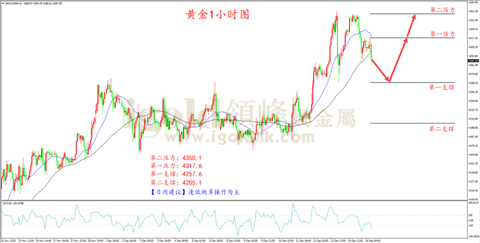 近期金价经过一个多月的回调和震荡后,金价形成日线级别三角形,但随后向上突破该三角形并向上突围,最高上行至4353.3附近,但由于前期攻势太强,多头动能在上周五美盘时段有所衰弱,重新下探4257.6附近低点,并再次迅速上行,显示多空动能在非农行情到来之前的能量转化。叠加日线、4H、1H图中各级别均线均呈现出多头排列,或预示行情有可能在非农数据支持下去测试前期历史高低点4381.0附近。可关注非农数据对金价的影响变化。
