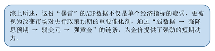 数据显示,美国11月ADP私营部门就业人数减少3.2万人,远低于市场预期的增加0.5万至1万人,并创下自2020年6月以来的最差单月表现。数据公布后,市场反应迅速:金价短线拉升:现货黄金价格应声上涨,短时间内拉升约6-10美元,最高触及4241.42美元/盎司。同时美元指数短线下挫约8个点。此次就业市场的意外萎缩,被视为美国经济动能放缓的关键信号,并立即强化了市场对美联储降息的预期。降息预期的升温直接削弱了美元吸引力,导致美元走软。由于黄金以美元计价,美元贬值降低了其他货币持有者的购买成本,从而提振了黄金需求。此外,数据加剧了市场对经济可能从“软着陆”转向“硬着陆”的担忧。在经济不确定性上升的背景下,黄金的传统避险属性获得关注,吸引了寻求资产保护的资金流入。