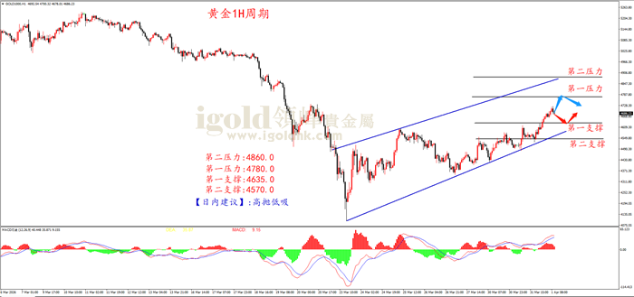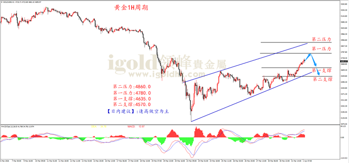 日内震荡节奏加大,短线操作节奏上,寻找出较好的短期支撑和压力是操作的关键。上方第一压力4780.0,第二压力4860.0,下方第一支撑在4635.0,第二支撑4570.0。非农数据时,根据数据公布的利多利空情况,结合支撑和压力位的破位情况,可以灵活选择方案对应操作,注意严格控制仓位风险。
