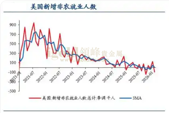 美国2月非农就业数据明显弱于市场预期,就业市场边际放缓迹象进一步显现。2月非农新增就业录得减少9.2万人,不仅显著低于前期水平,也打破了此前市场对于美国劳动力市场正逐步企稳的判断。与此同时,前两个月就业数据继续遭到下修,去年12月与今年1月合计下修6.9万人,导致截至2月的三个月平均新增就业降至接近零增长的水平,就业扩张动能较年初明显回落。