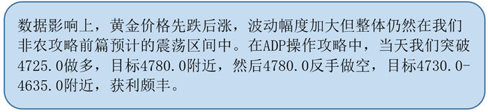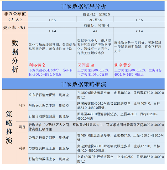 日内震荡节奏加大,短线操作节奏上,寻找出较好的短期支撑和压力是操作的关键。上方第一压力4800.0,第二压力4895.0,下方第一支撑在4604.0,第二支撑4480.0。非农数据时,根据数据公布的利多利空情况,结合支撑和压力位的破位情况,可以灵活选择方案对应操作,注意严格控制仓位风险。但由于非农数据具有高度不确定性,黄金近期的波动幅度又足够大,故短线上黄金也同时存在多种可能性,因此投资者也需要提前做好各种可能走势的技术分析,以及面对数据的不同结果,应该采取的各种应对策略,以做到有备无患。接下来本文将着眼于技术分析,根据数据结果的不同,向投资者提供多种预判性操作建议,以供参考。