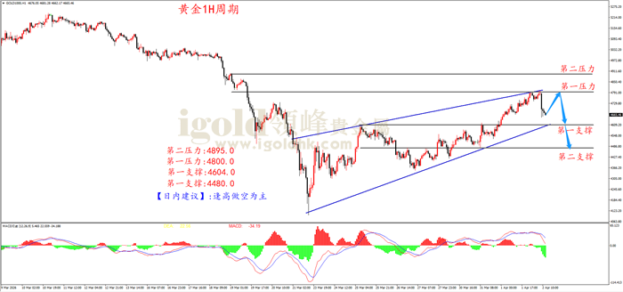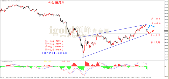 目前临近非农数据公布,黄金市场波动明显放大,3月18日以来,金价空头发力跌穿5000.0美金关口后,一路单边暴跌至4100.0美金附近,日线处于明显空头趋势浪中,局部金价4100.0止跌企稳,多头开启超跌反弹走势节奏,目前反弹高点4800.0美金关口,黄金承压再次跳水近150美金幅度,空头力量强势,短线再次进入宽幅震荡多空拉锯博弈局面,日内宽幅震荡空间加大,短线操作获利机会增大,日内市场资金在等待美伊战争结果驱动,同时市场正好赶上非农数据的公布,行情或许将借助本周的超级数据来为后市指引方向。