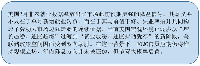 美国2月非农就业数据明显弱于市场预期,就业市场边际放缓迹象进一步显现。2月非农新增就业录得减少9.2万人,不仅显著低于前期水平,也打破了此前市场对于美国劳动力市场正逐步企稳的判断。与此同时,前两个月就业数据继续遭到下修,去年12月与今年1月合计下修6.9万人,导致截至2月的三个月平均新增就业降至接近零增长的水平,就业扩张动能较年初明显回落。